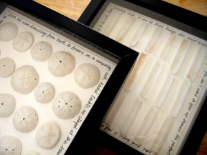 Then glue your paper with the shells and writing to the backing cardboard that comes within the frame (the piece that has a square cut out of it to frame a photo/image). You then have your very own shell-art!
