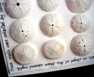Once the glue has dried you can take your fine black pen (not a biro or Bic pen – preferably a fine nib pen from a newsagent or art supply shop) and start to add writing/descriptions next to the shells or around the outside of the frame – wherever you like – again, there are no rules!