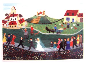 My Great Aunt (she is no longer with us) gave this to mum , and on the eve of my wedding day mum left it on my pillow with a beautiful letter (yes, there were tears!). She has also written our names and wedding date on the back of the tile. Wedding Procession is printed on the back in German (Hochzeitszug) and French (Le Cortege Nuptial ). I have actually found several items by Laplau for sale on ebay and other online sites if anyone is interested. The artist Gérard Laplau is a French folk artist. His most famous work is the naif series from Villeroy & Boch. He died on July the 14th 2009 in Saint-Céré, France.