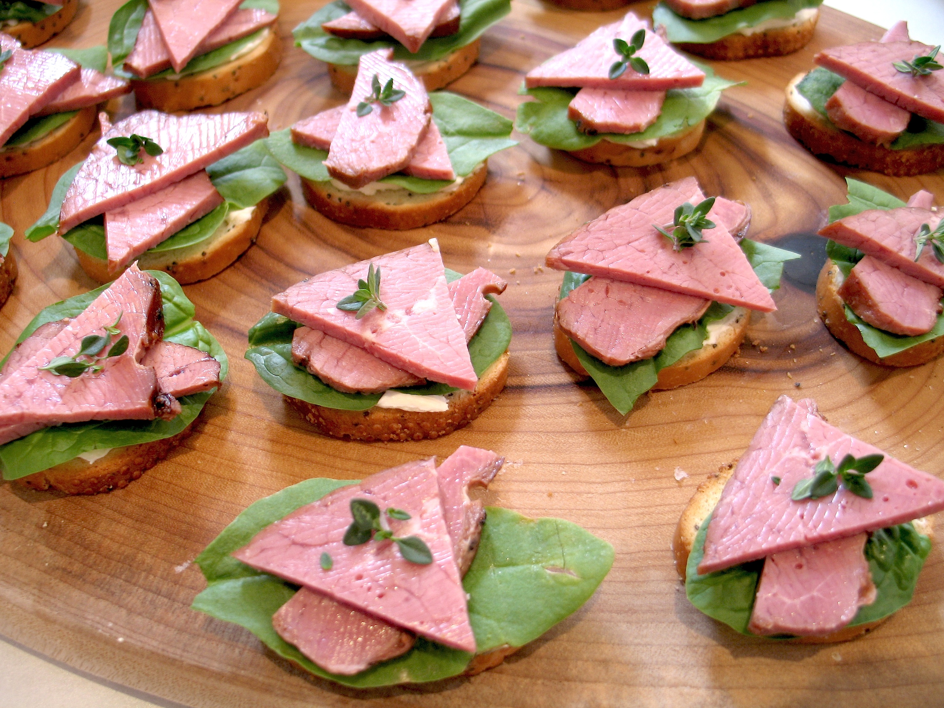 Make these just before your guests arrive or the cream cheese will make the bagel crisps go a little soft. Lay the bagel crisps out on the serving plate. Spread each one generously with cream cheese. Place a neat and clean small spinach leaf on top of the cream cheese. Overlay 2 pieces of pastrami on the spinach leaf. Place a small sprig of fresh thyme on to of the pastrami as garnish (the thyme serves a greater purpose than just garnish, it adds an amazing flavour to the canape)