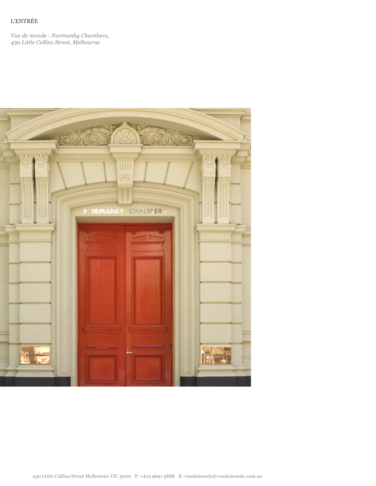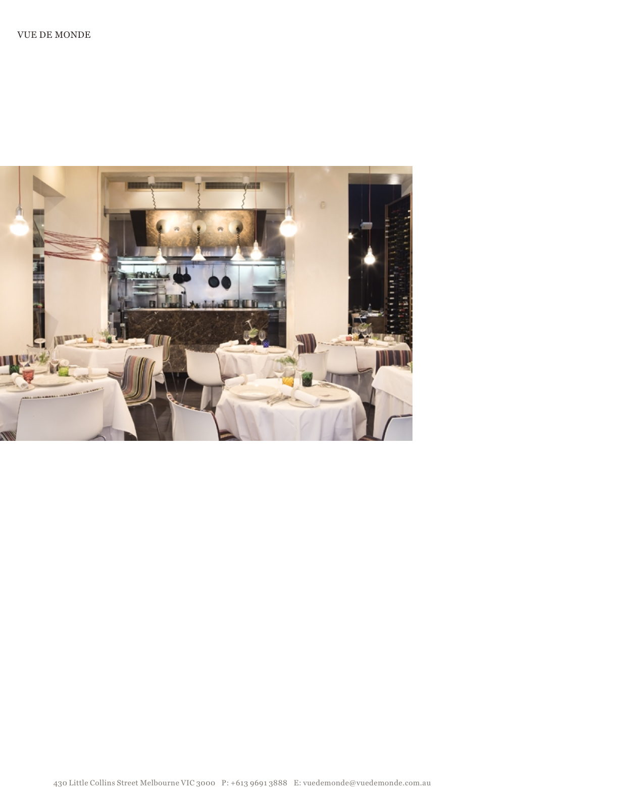 “Located in the historic Normanby Chambers building in the heart of CBD Melbourne, Vue de monde pays homage to classical fine dining, encompassing this philosophy through food, service and ambience. Vue de monde is testament to the belief that restaurant food can be a wondrous, unforgettable experience.