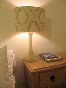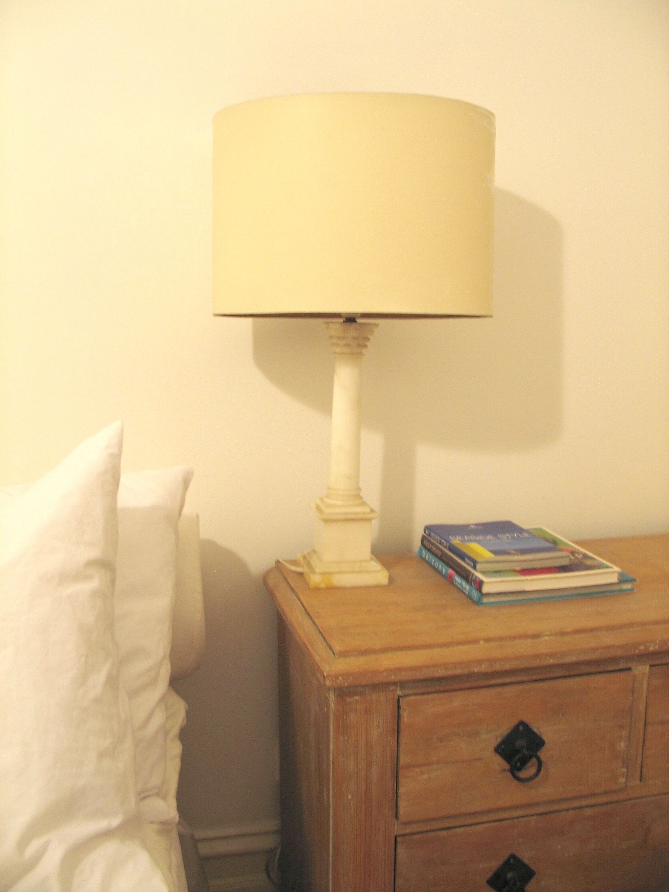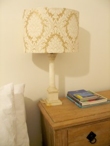 I had received a hand-me-down lampshade from my grandmother (via mum). It had a rather grand marble base that could also second as a lethal weapon, which had a chip out of the bottom corner (which begs the question… once upon a time, ‘did Gran test this out as a weapon’). I could handle the chip in the base (whilst intrigued as to how it got there!)… I simply turned the base so the chip faces the back wall – problem solved. What I particularly liked about it was the oval shaped lampshade. What I didn’t like about it was the cream lampshade looked washed-out with the white marble base.