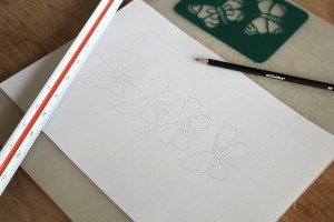 Take your butterfly stencil and trace the butterflies onto the space that will be displayed within the frame (remember there is usually a cardboard insert that sits within the frame, so your butterflies need to sit within that area). You can place the butterflies wherever you like – just make sure there is enough space between each one to allow the paper to hold its shape once you cut around the butterflies (aim for at least 1cm between each butterfly).