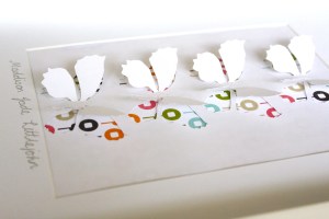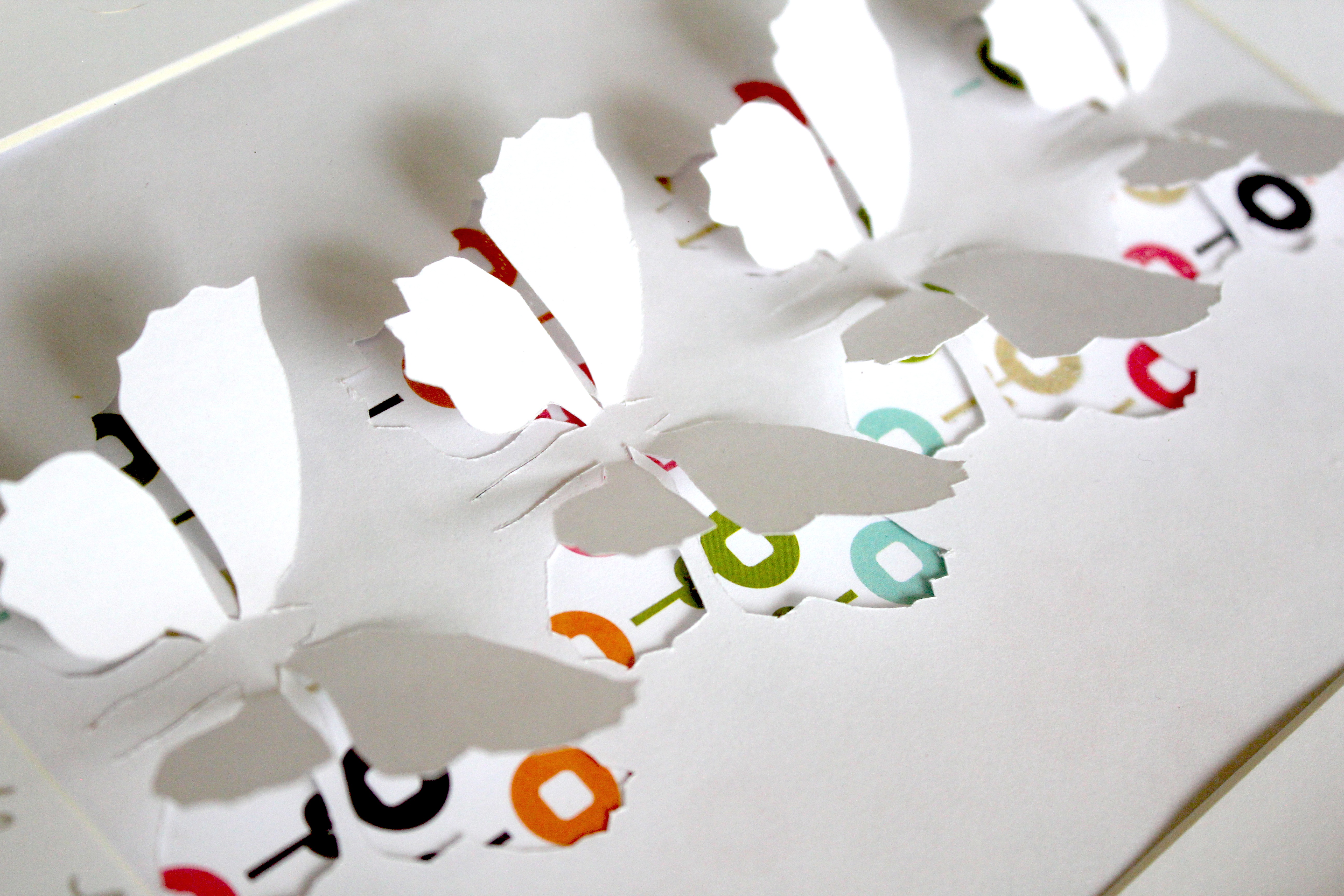 Take your cutting/Stanley knife and commence cutting around the outline of the butterflies. Make sure you don’t cut around each butterfly completely, you need to keep each one attached in several places. I found leaving the ‘body’ of the butterfly attached was the most effective, whilst cutting around the wings.
