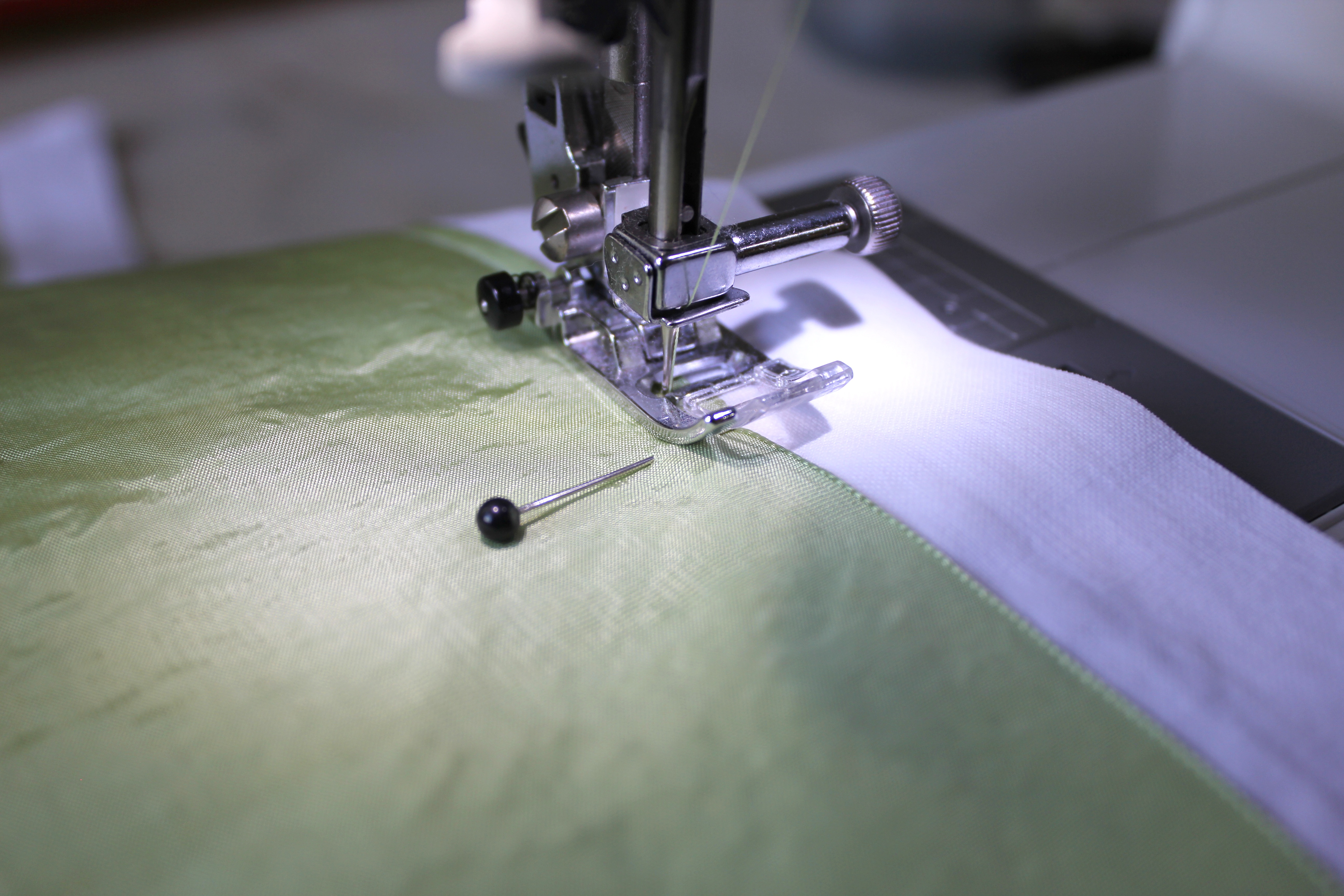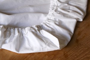 To thread the elastic around the sheet you will need a safety pin. Attach the safety pin to the end of the elastic (tip: fold the elastic over so it is doubled up when you attach the pin, otherwise it will fray as you are threading, and the pin will separate from the elastic – speaking from experience!). Slowly feed the safety pin around the edge of the sheet (through the tube you created when hemming the sheet), allowing the elastic to feed through with it.