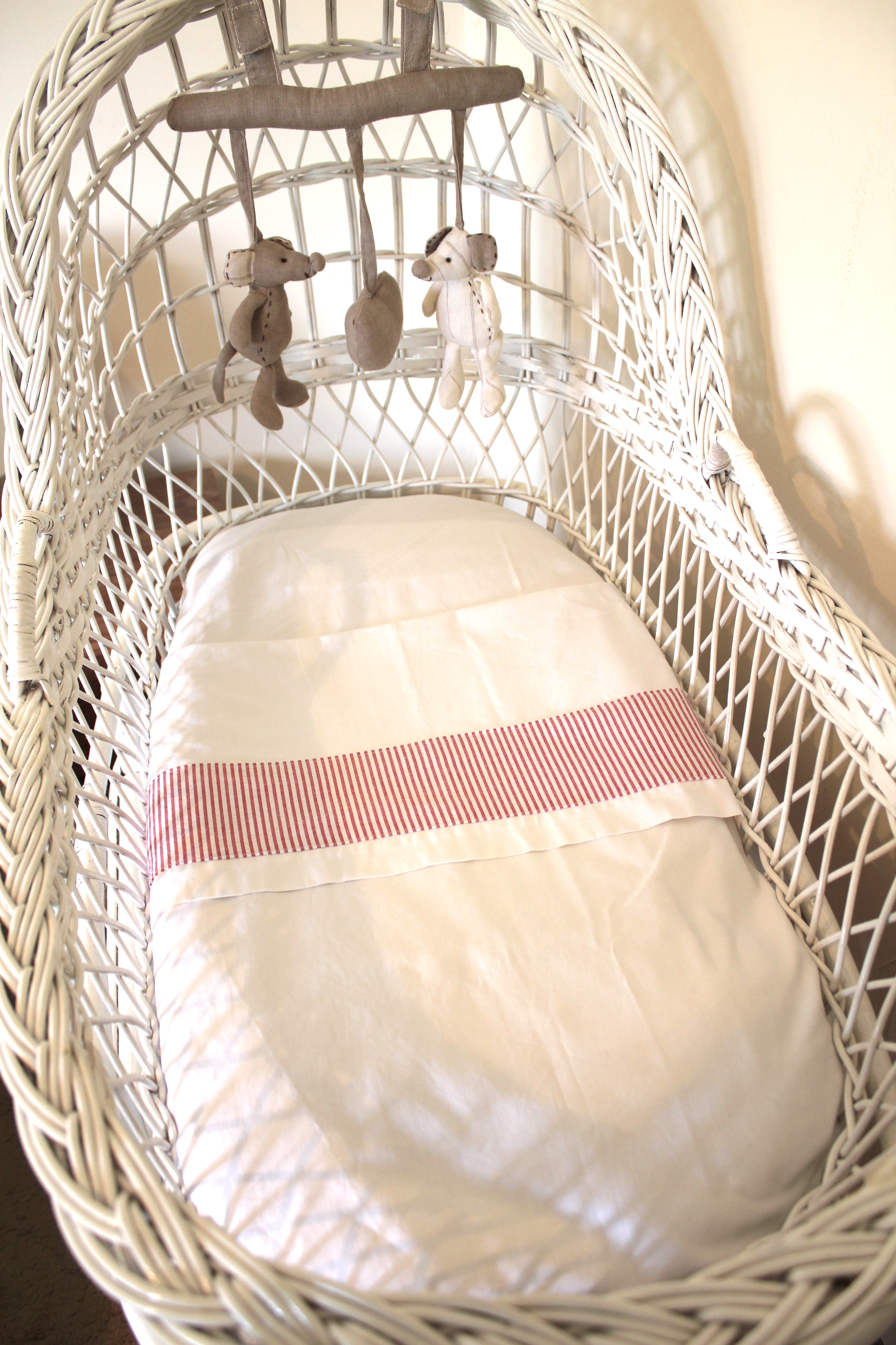 They were only selling the bassinet, on a stand with wheels – no mattress or sheets etc. So we then had to hunt down a mattress that would fit, and some sheets. My husband also gave it a freshen-up with a can of white spray paint (I wasn’t allowed to use the spray paint being pregnant. It was a miracle I was able to keep my nose out of that part of the transformation!).