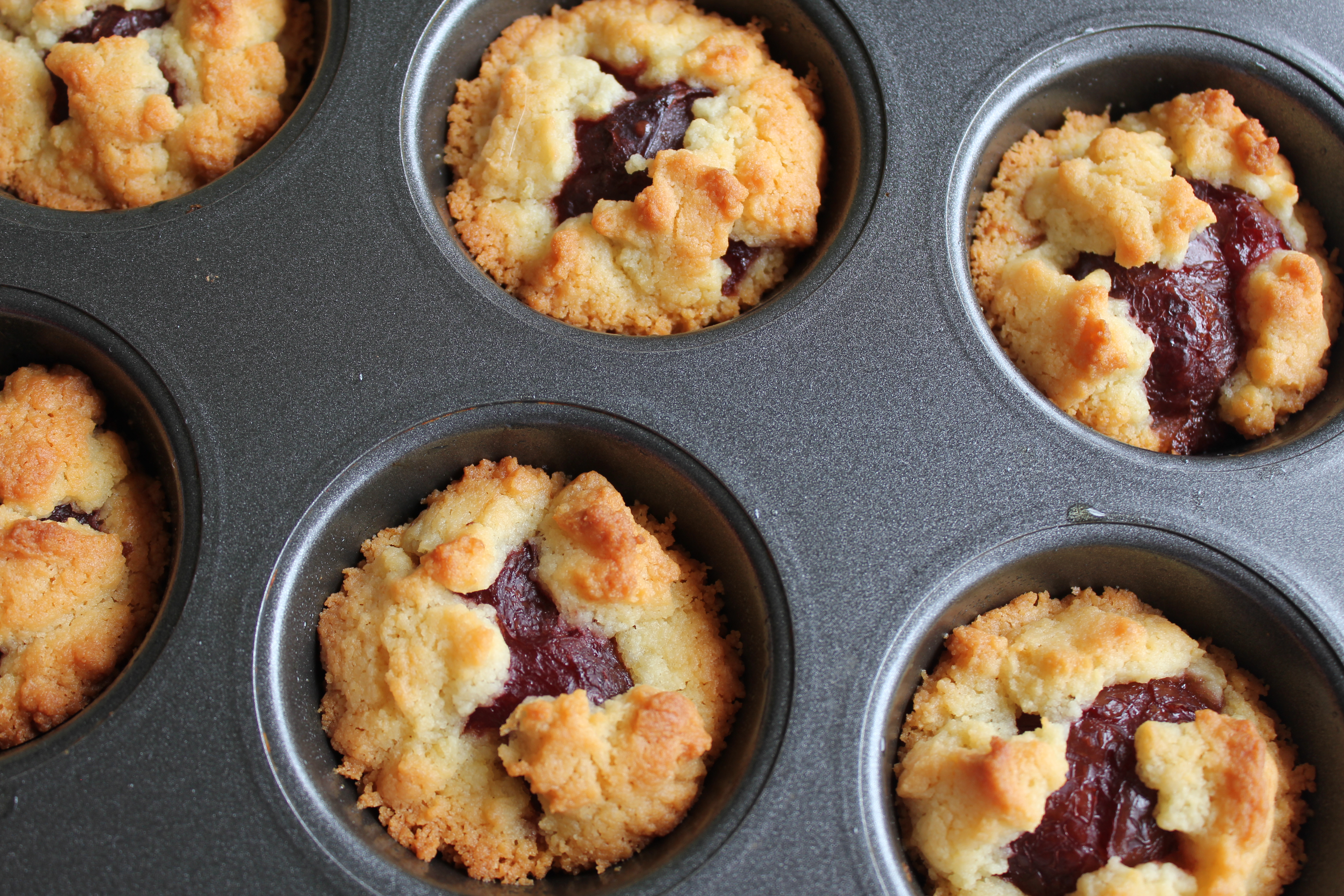 Alternatively: Instead of apples, I used tinned plums in my mini German cakes. I simply placed half a plum (removing the pip) in each muffin tin. The same could be done with tinned apricots, or black cherries. Make sure you drain the juice from the fruit to avoid soggy cakes! I juts added the fruit (no spices, sugar or sultanas), but you could still add the spices if you wish.