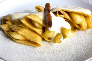 I served these up for my husband last week when he was home on a week day. I tried to keep them as healthy as possible – using fruit as the filling, wholemeal flour in the crepes, and natural yoghurt instead of cream/ice-cream as a topping… here’s the recipe: