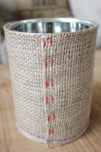 I covered the tin with burlap. I used two layers stuck together with iron-on webbing (so you can’t see through to the tin). I then sewed the burlap around the tin with red embroidery thread (holding it around the tin as I sewed to ensure it was firm enough to stay on). If you use the finished edge of the burlap, you don’t have to hem the burlap at the bottom of the tin.