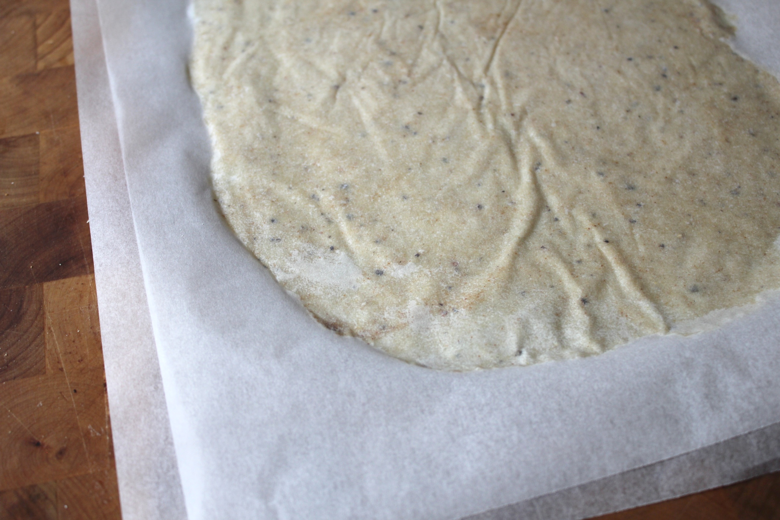 Cut 2 pieces of baking paper (the size of a baking tray). Lay one sheet on the bench, and place the dough (shaped into a rectangle) onto the baking paper. Place the other sheet over the top of the dough. Take a rolling pin (or glass jar on it’s side) and roll the dough out as thin as you can between the 2 sheets of paper.