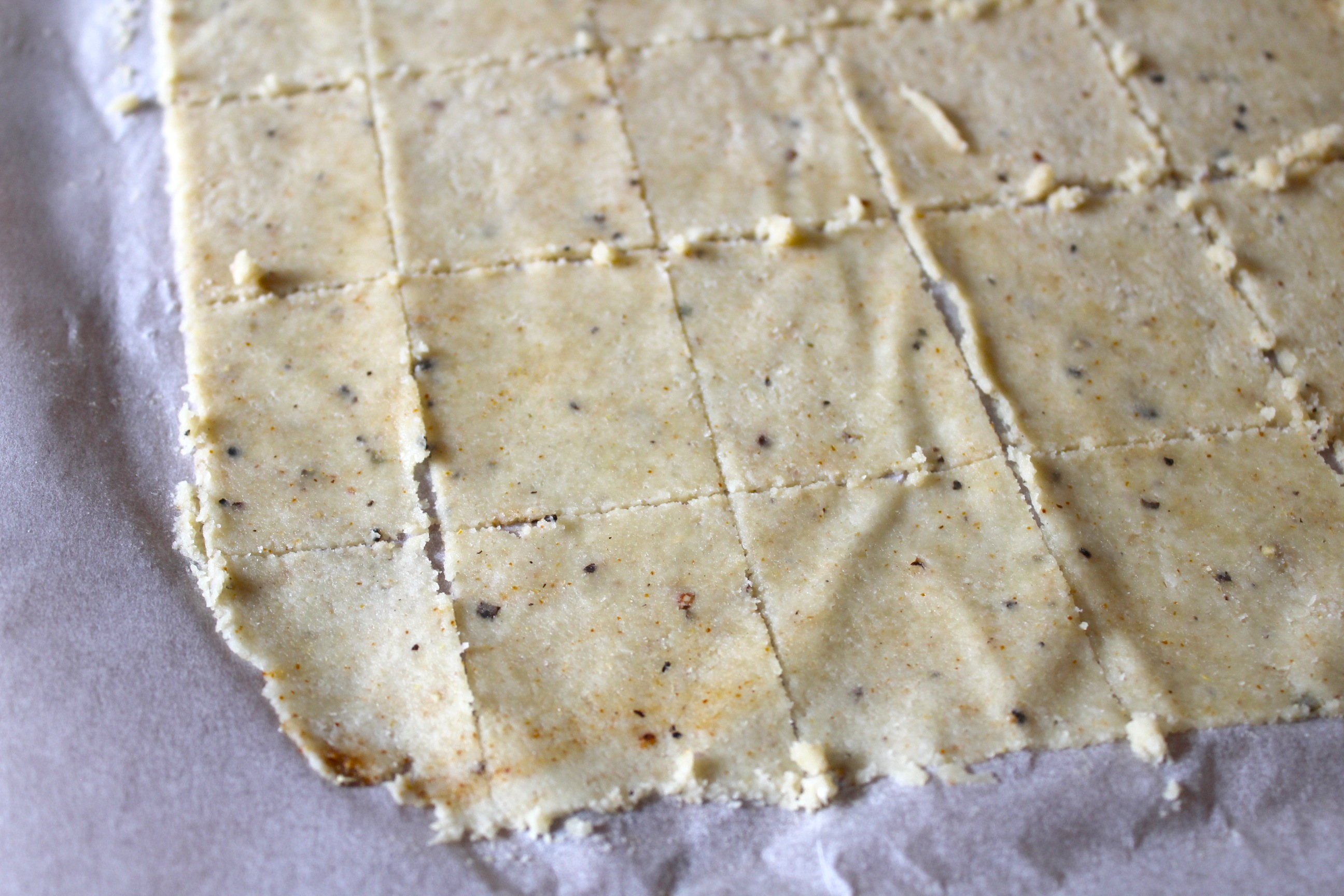 Remove the top piece of paper, and score the mixture into square biscuit sized shapes with a sharp knife (or any other shape you might prefer).