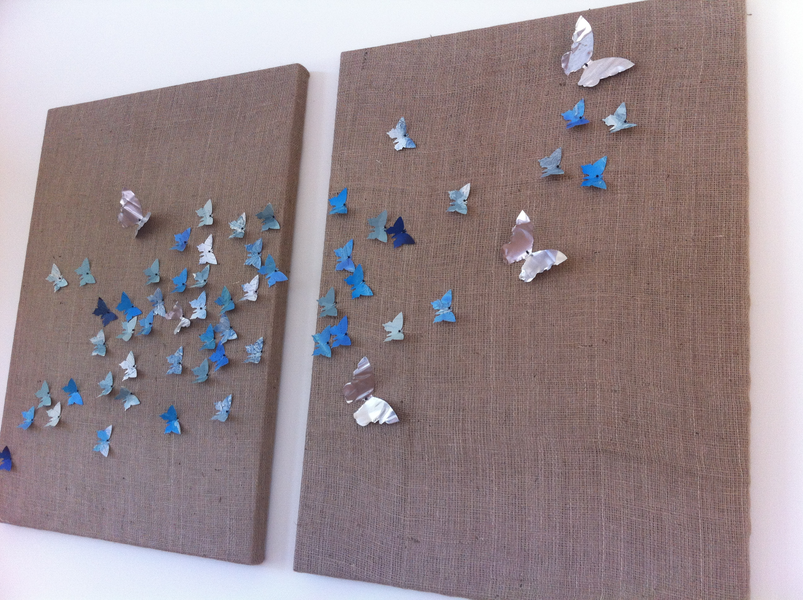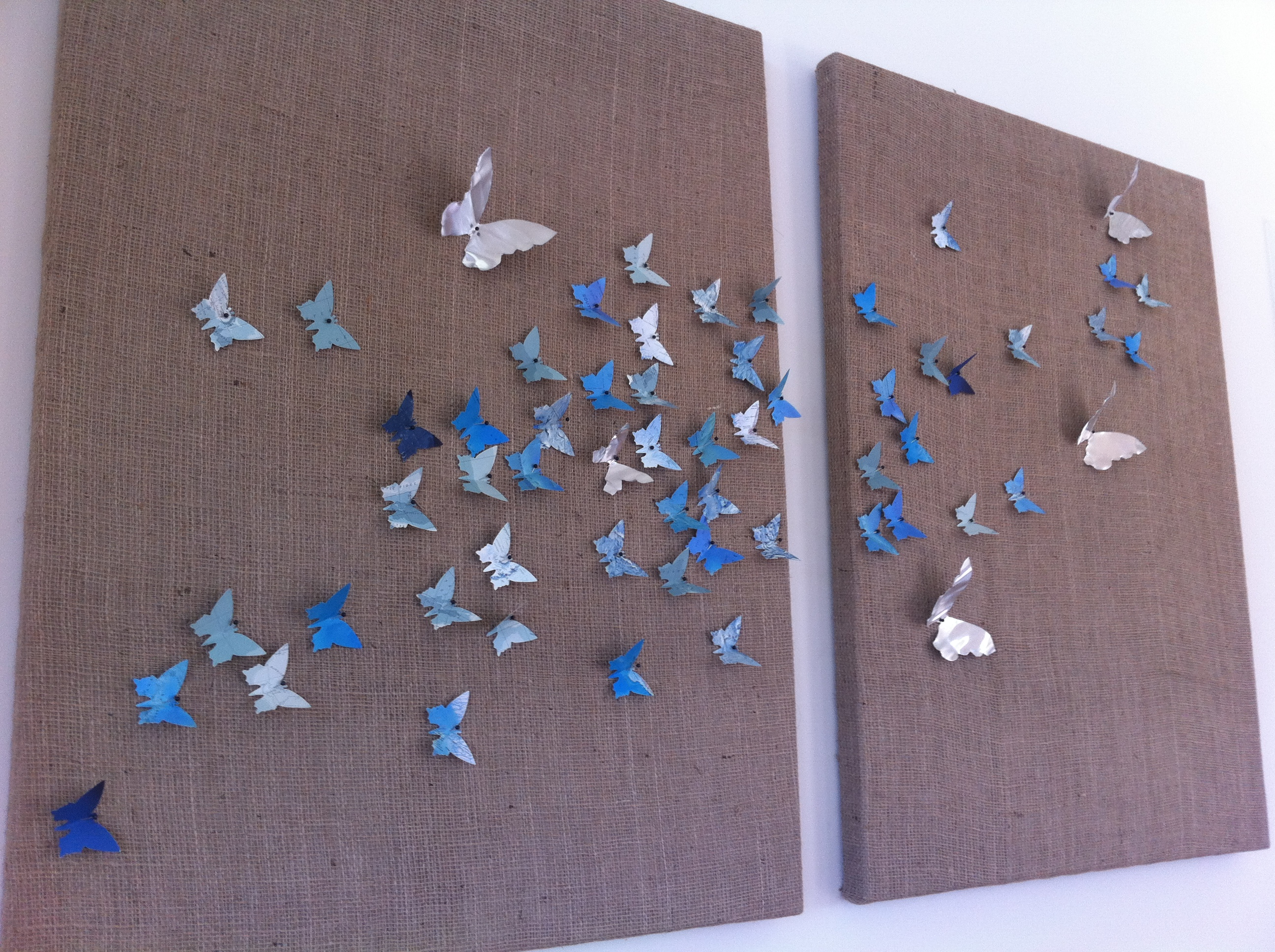 I used a butterfly-punch to cut butterflies from old atlas pages, then pinned them onto the canvases. I did add a few metal butterflies (which I hand cut), for a little interest.