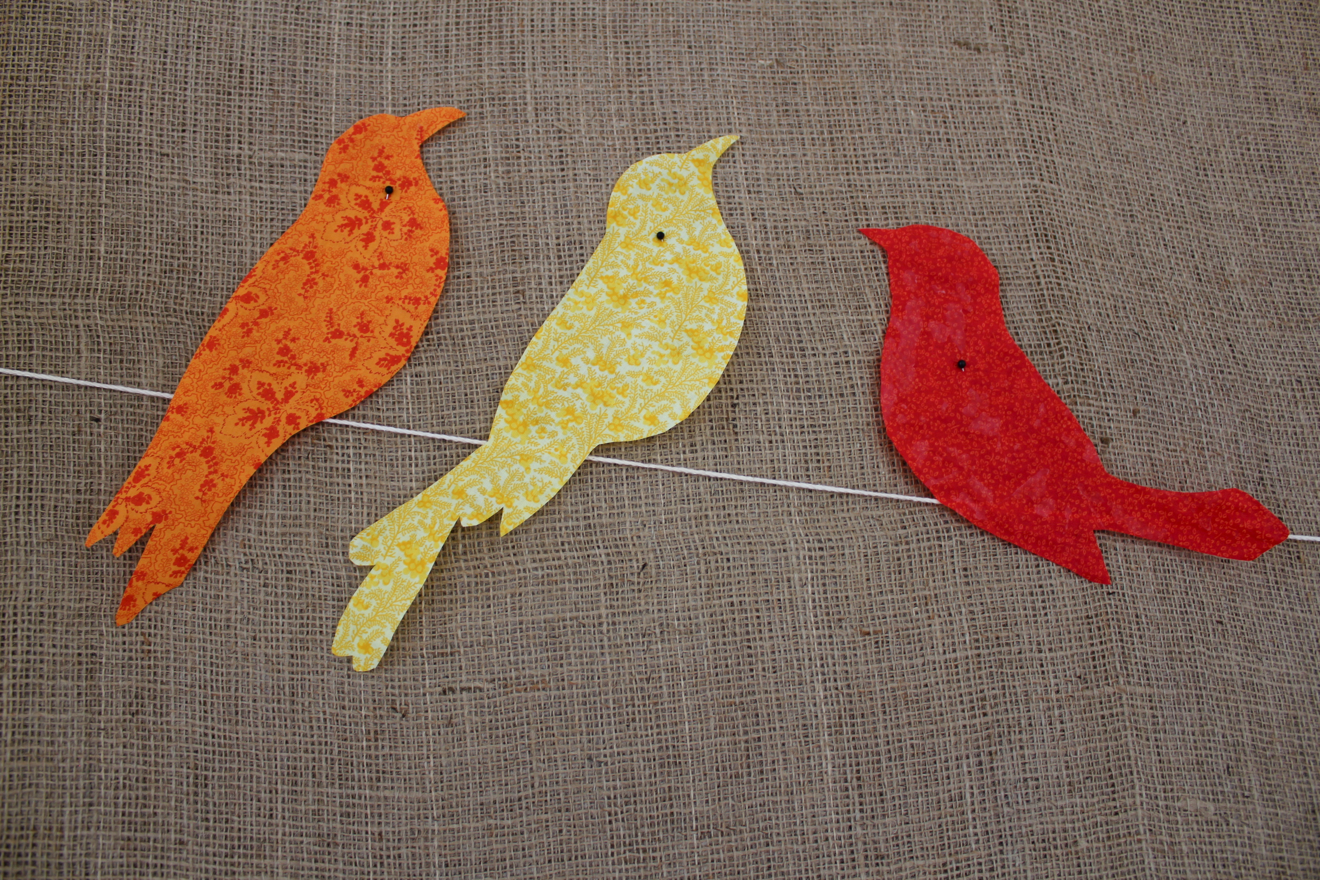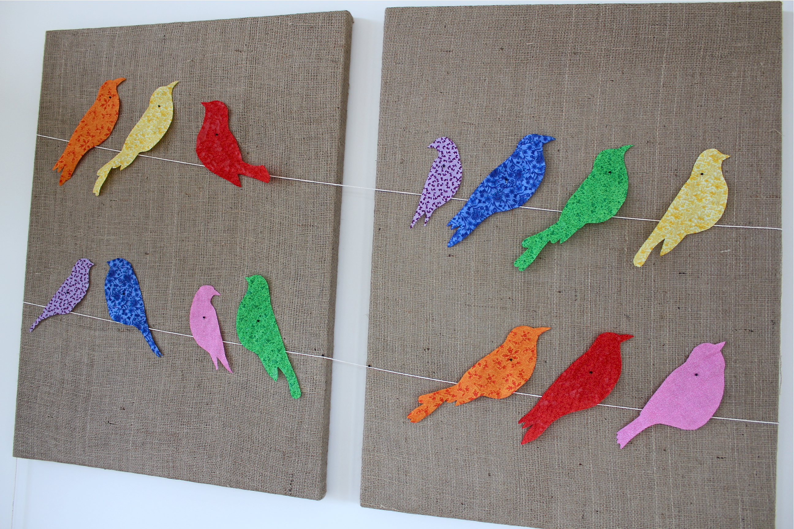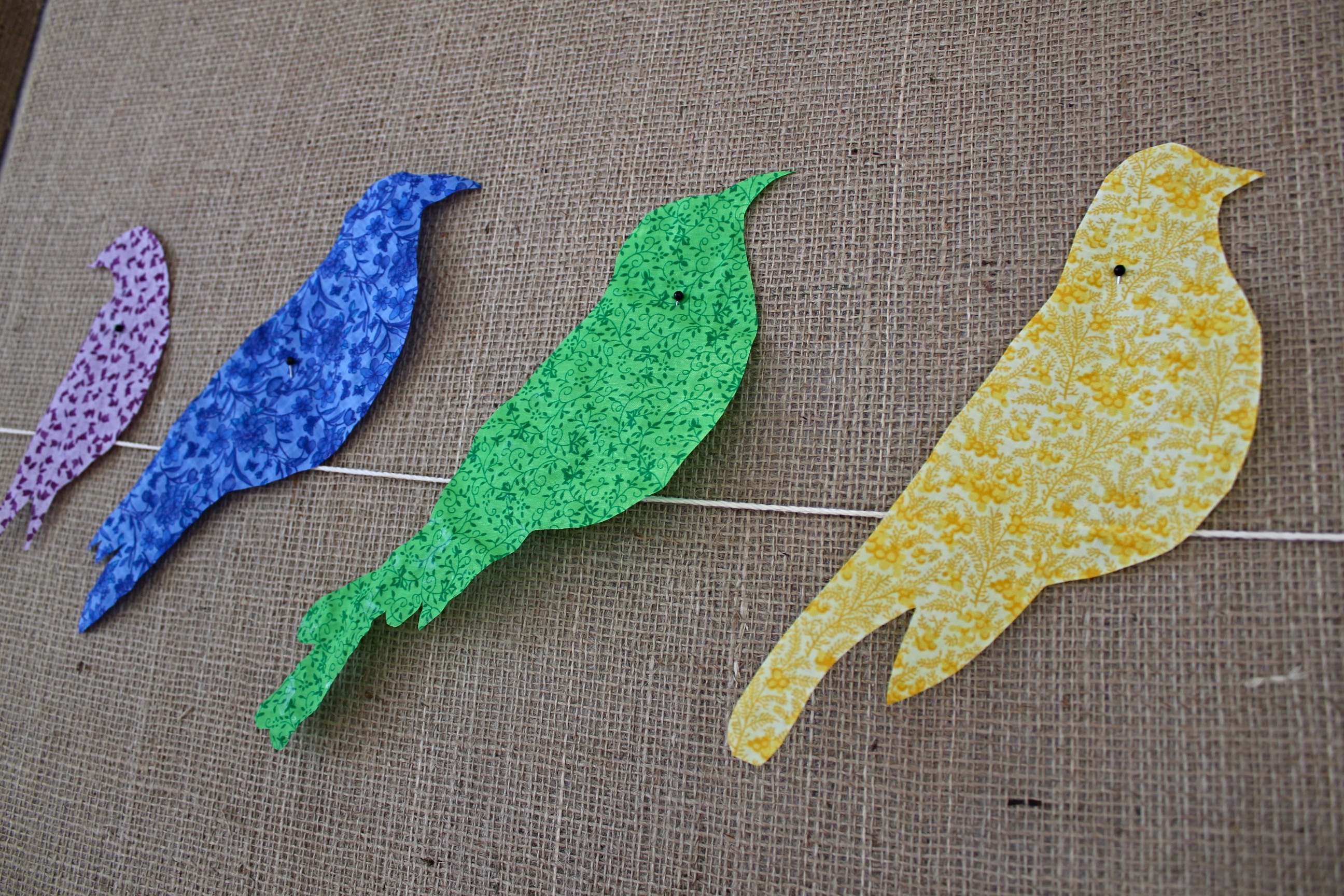 2. Birds – I completed these last week. I chose some very colourful quilting fabric. Then painted the back of the fabric with craft glue (to stiffen it, and to allow me to cut the fabric without it fraying – once it was dry). I got my bird inspiration from some stencils pinned on my Crafty Ideas board on Pinterest.