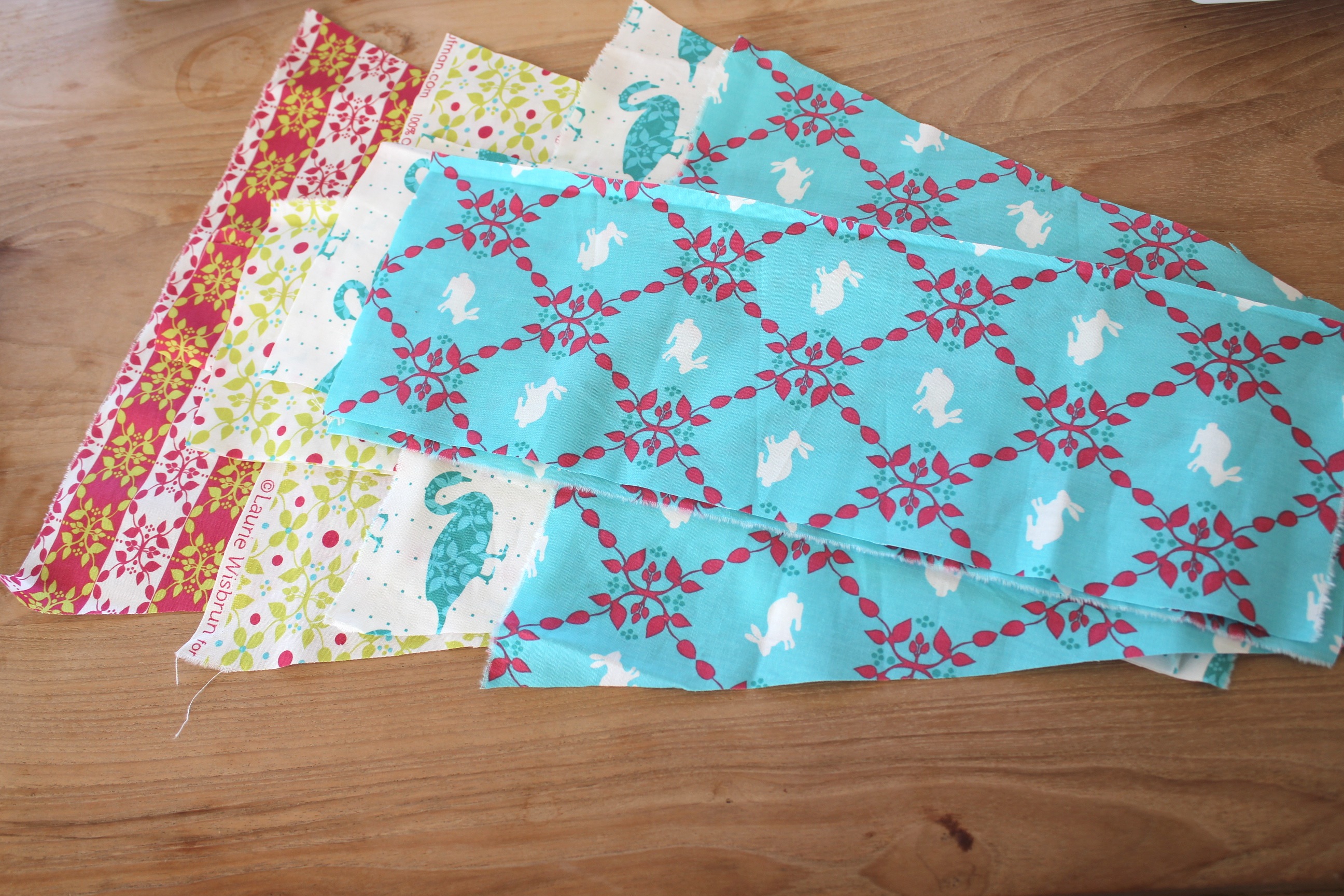 For each bunting piece I also cut two rectangles to act as ties for each triangle (so I could attach each bunting to the piece of wood).
