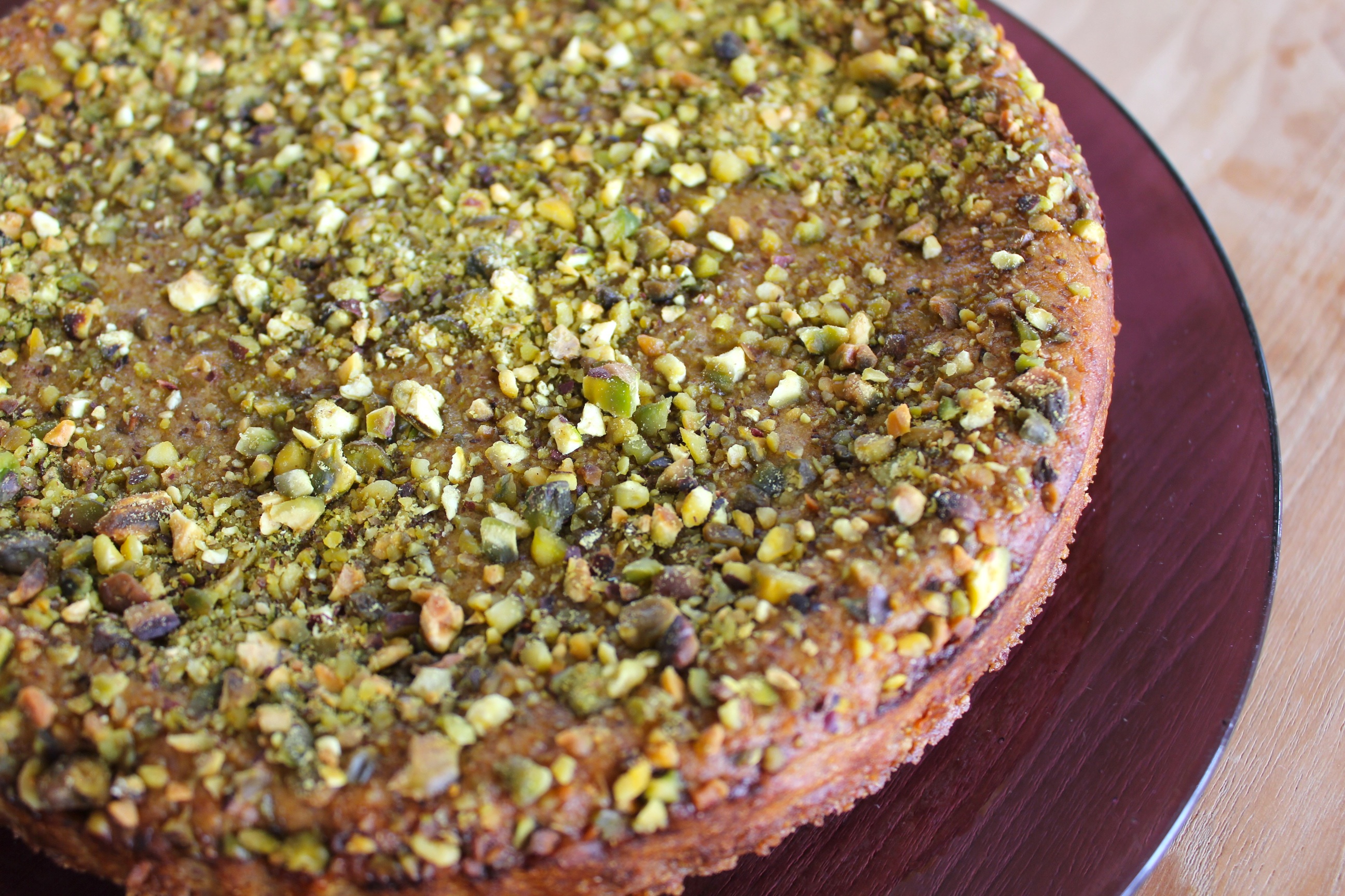 Scatter with pistachios around the edge and bake in oven til golden brown, 35 – 40 minutes. Make sure that the top of the cake doesn’t wobble if you shake the tin slightly.